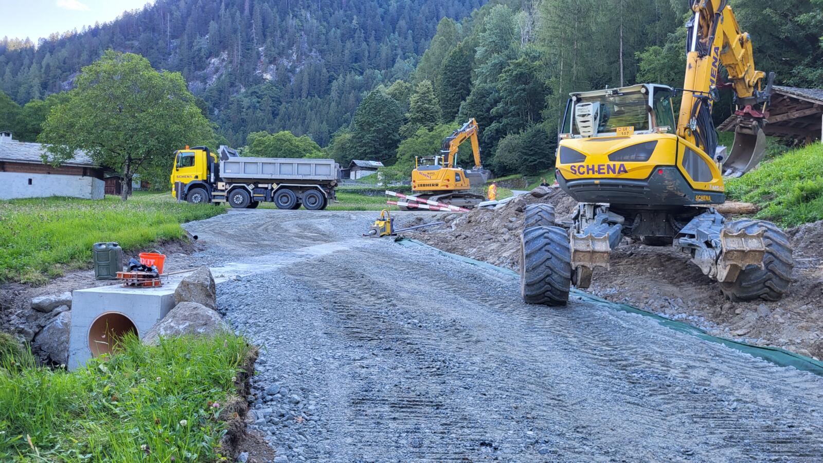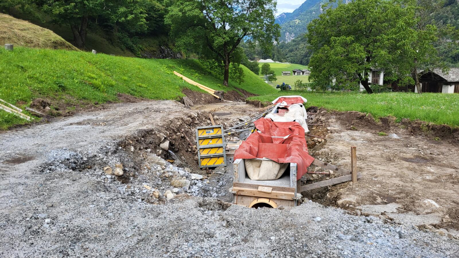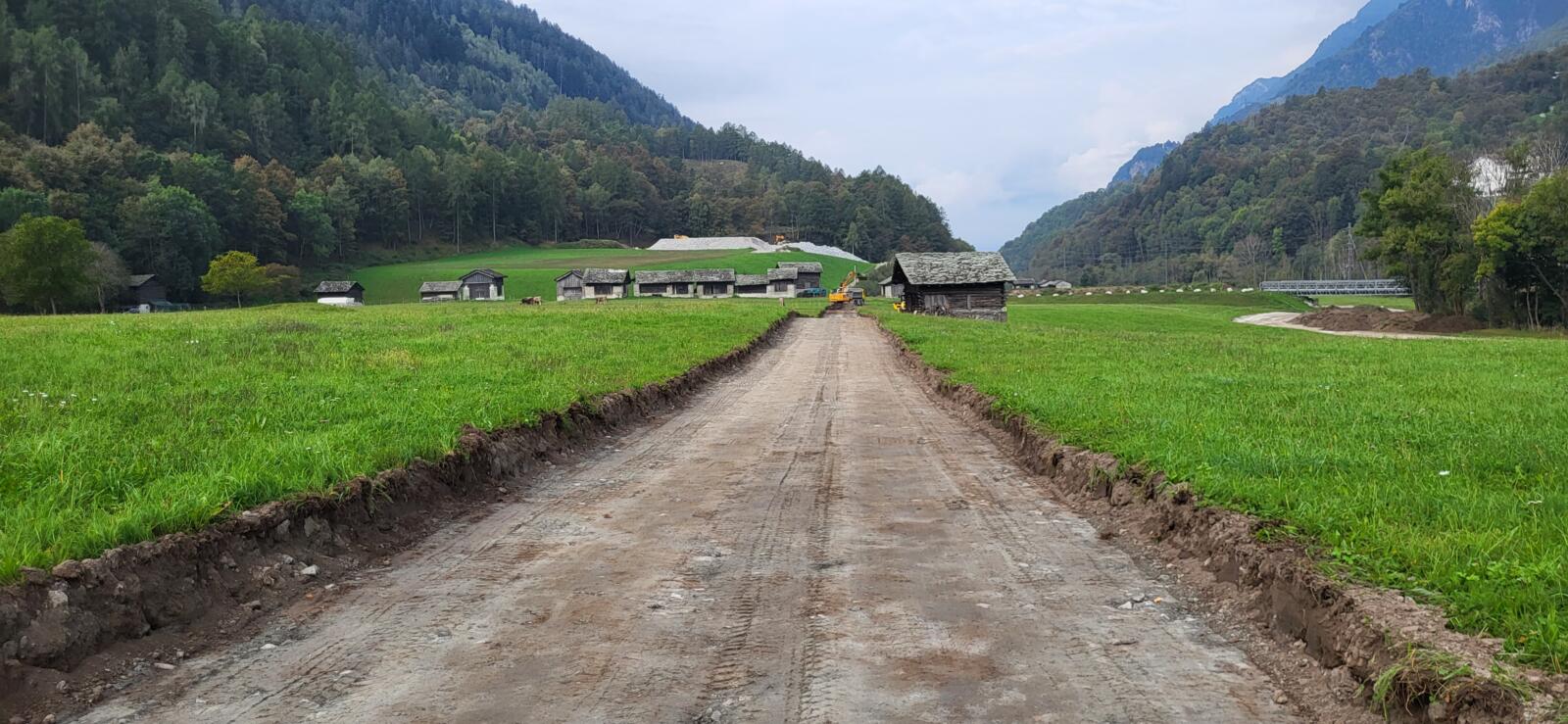 Das Projekt der bautechnischen Massnahmen umfasste den Bau einer neuen forstlichen Erschliessung, zwei neuen landwirtschaftlichen Erschliessungen sowie einer Dumperpiste für die Entleerung des Schutzdammes Bondo im Bedarfsfall. Die Gesamtlänge, der Wegnetzes beträgt rund 1.9 km, während die Länge der rückgebauten Strassenabschnitte etwa 4.9 km ausmacht. Die Bauarbeiten begannen im Sommer 2023 und wurden im Sommer 2025 abgeschlossen. Im Rahmen der Arbeiten erfolgte auch der Rückbau der Zufahrtsrampe für die provisorische Militärbrücke sowie die Wiederherstellung der betroffenen Flächen in ihren ursprünglichen Zustand, wobei ein besonderes Augenmerk auf die Aufwertung der bestehenden Aue gelegt wurde.